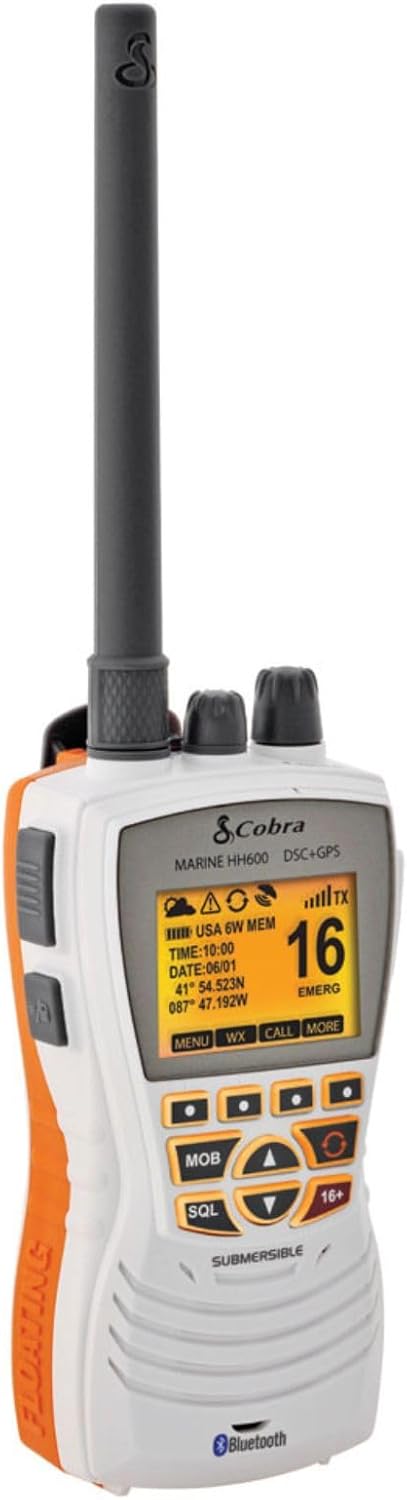 Cobra MR HH600WFLTBTGPS Handheld Floating VHF Radio 6 Watt, GPS, Bluetooth, Submersible, Noise Cancelling Mic, Backlit LCD Display, MemoryScan, White